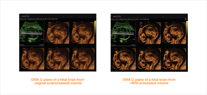 HD Volume Imaging™ (HDVI™) removes artifacts and incorporates a speckle reduction filter without compromising details but at the same time emphasizing the edge and structures. Therefore, 3D rendered image and multi-planar view provides an image quality with improved contrast and resolution. According to the result, it shows that the speckle noise of the image with HDVI™ is lower while the edge enhancement are higher, compared to the Original.